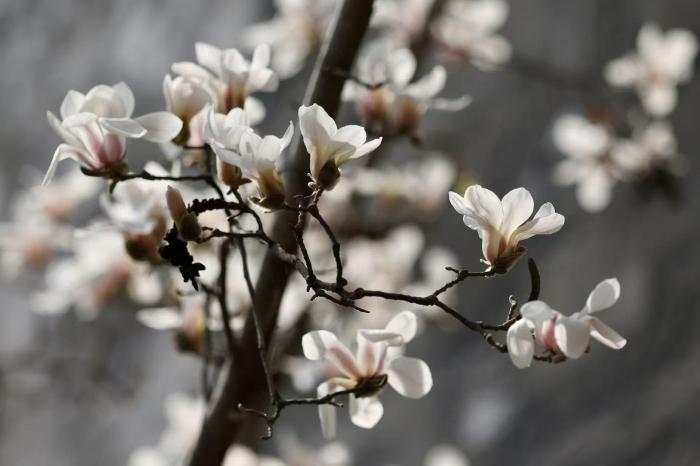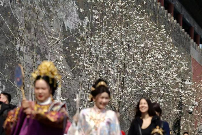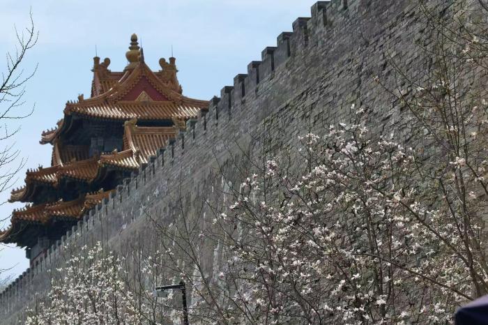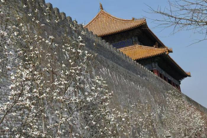 阳春三月,京城气温回暖,故宫东华门外的玉兰花迎来盛放期。洁白的花瓣缀满枝头,与朱红宫墙、灰青砖石、金黄飞檐相映成趣,勾勒出京城的春日画卷。
