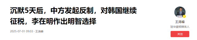 王涛峰2025-07-01沉默5天后,中方发起反制,对韩国继续征税,李在明作出明智选择